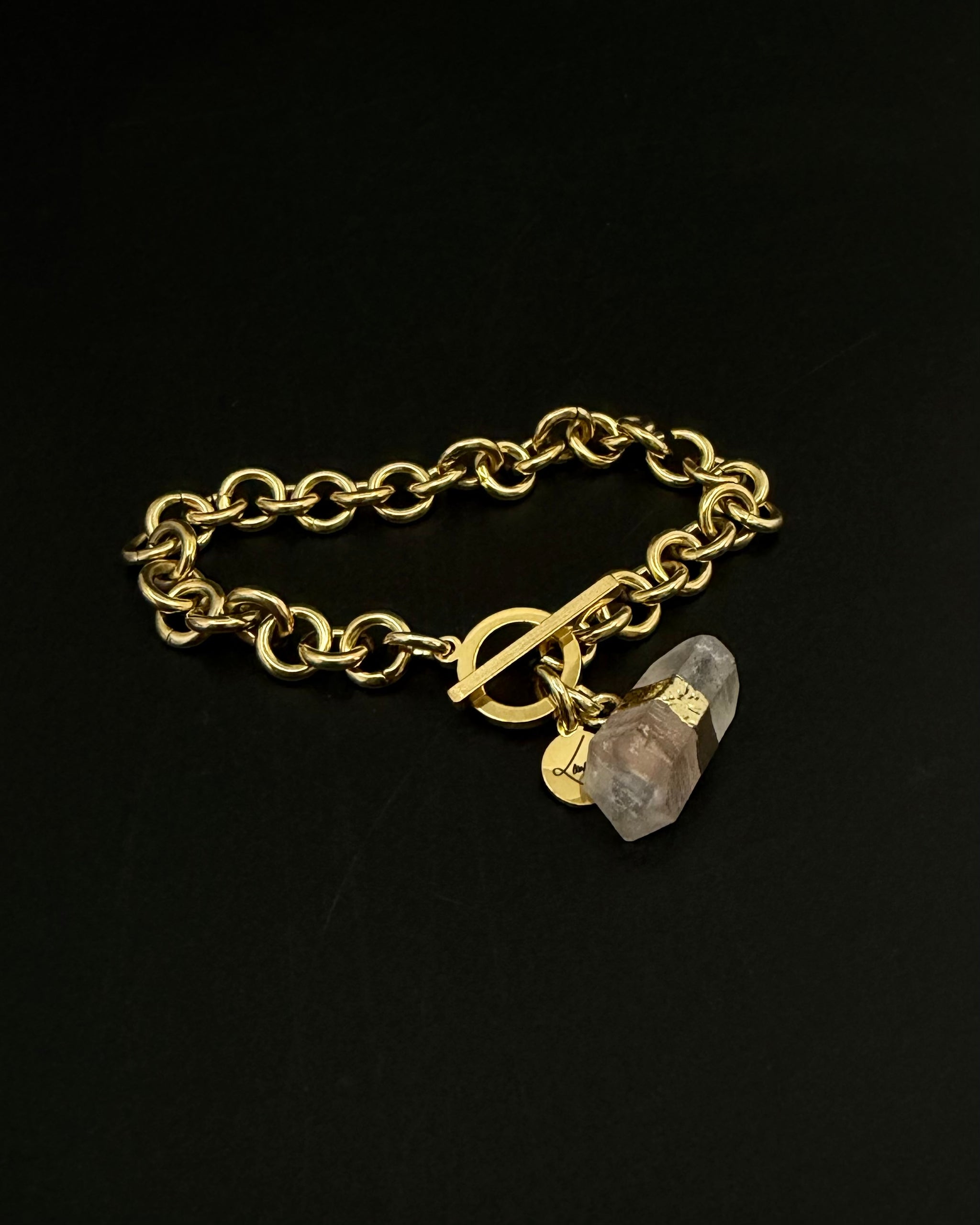 The Athena Axiom Bracelet in gold distils certainty into a lighter, more streamlined form. An 8 mm gold-plated stainless steel chain carries a raw quartz crystal, clear, deliberate and quietly powerful. This is clarity without excess, confidence without weight.