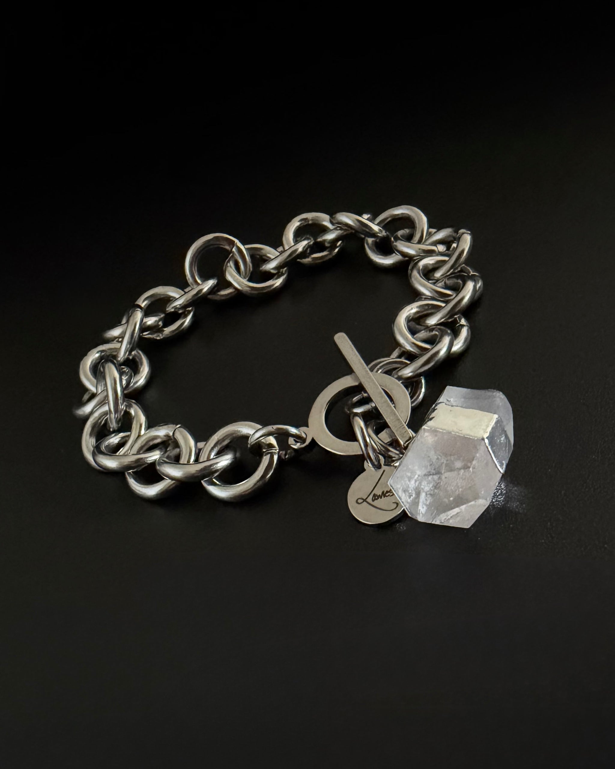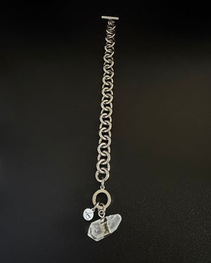The Athena Axiom Bracelet carries the same clarity and conviction as its necklace counterpart, distilled into a form that sits close and steady at the wrist. A substantial 12mm stainless steel chain anchors a raw quartz crystal, clear and unrefined, holding presence without ornament.