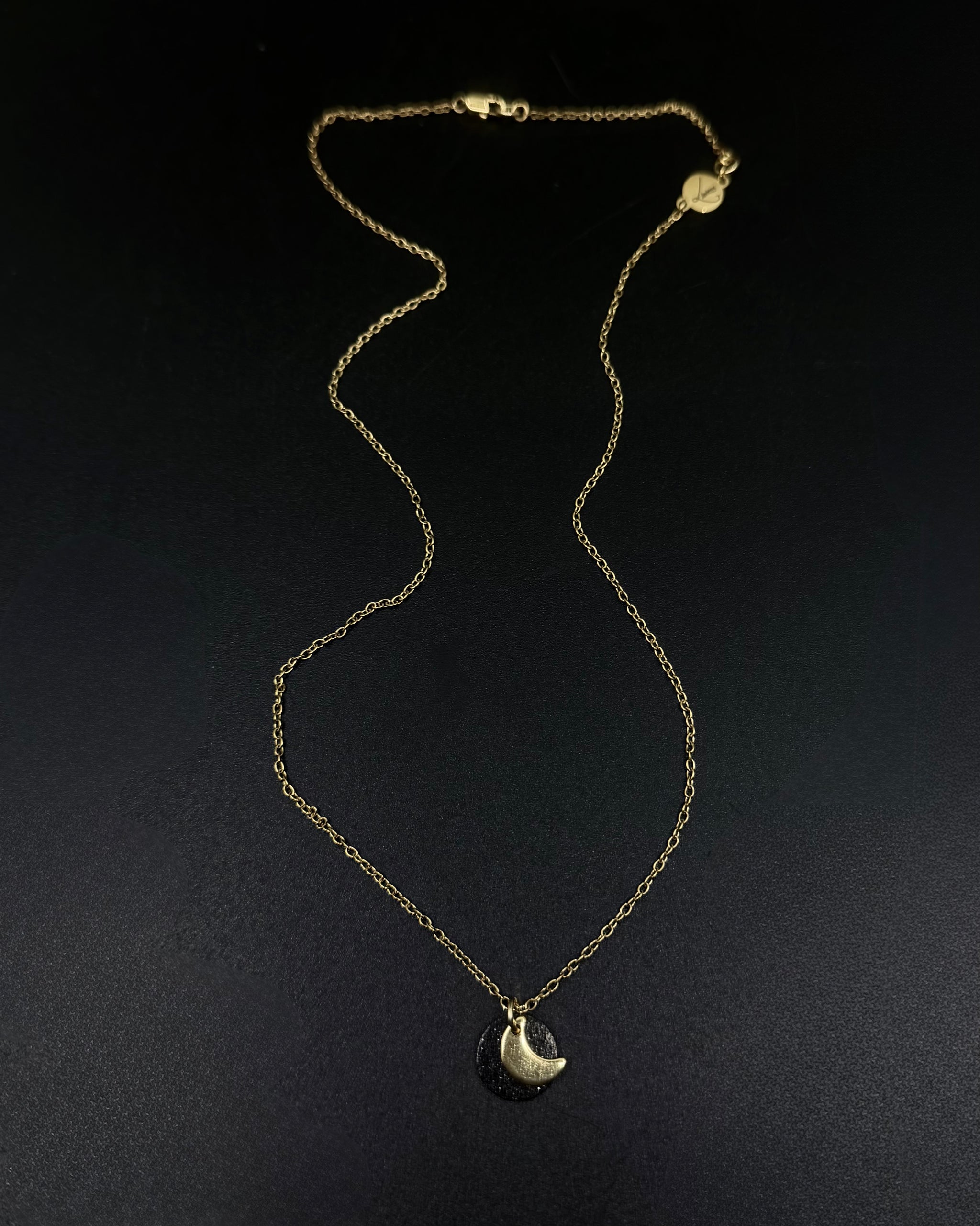 Features: Black disc with gold moon detail · lightweight pendant · hypoallergenic · tarnish-resistant