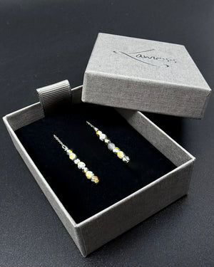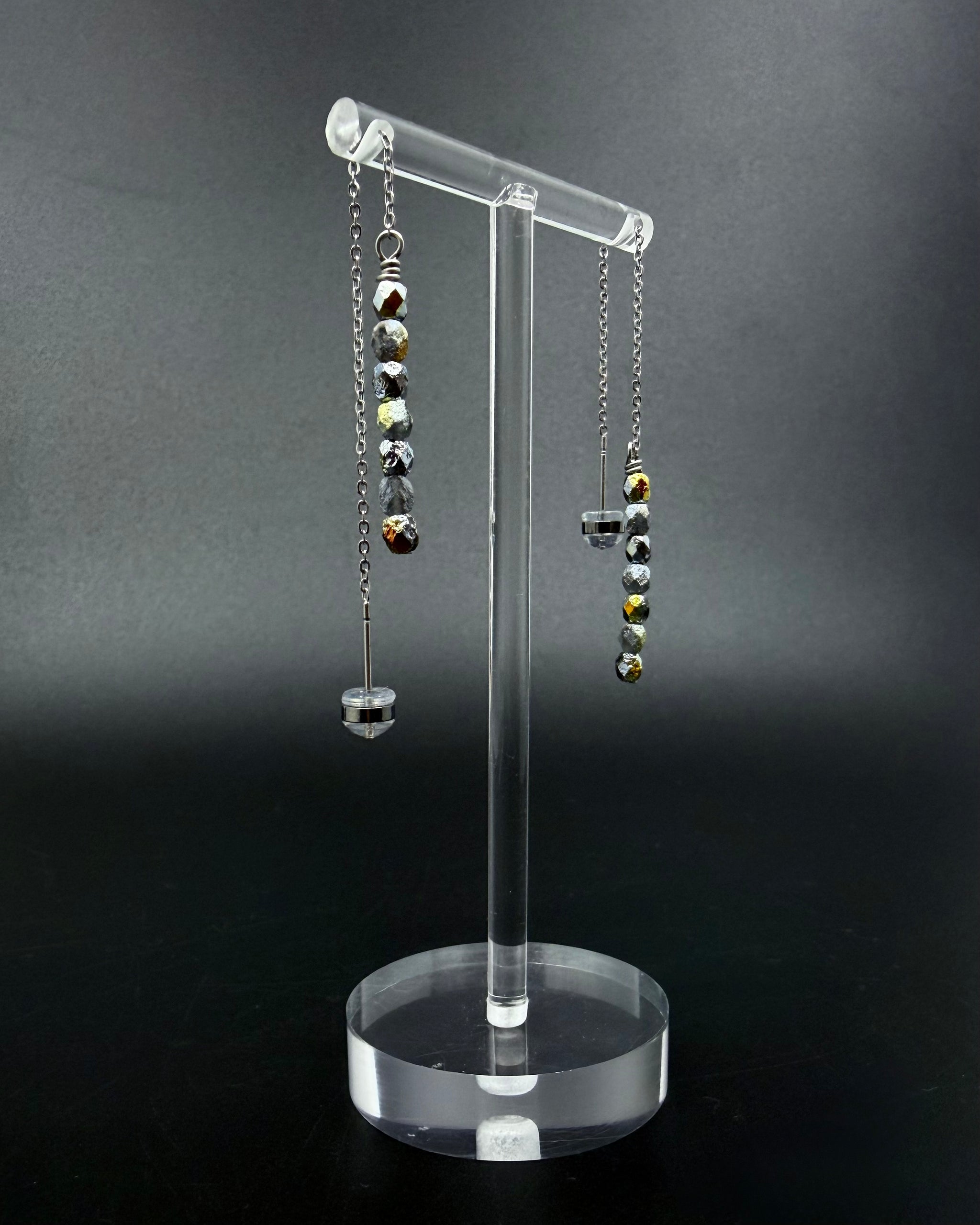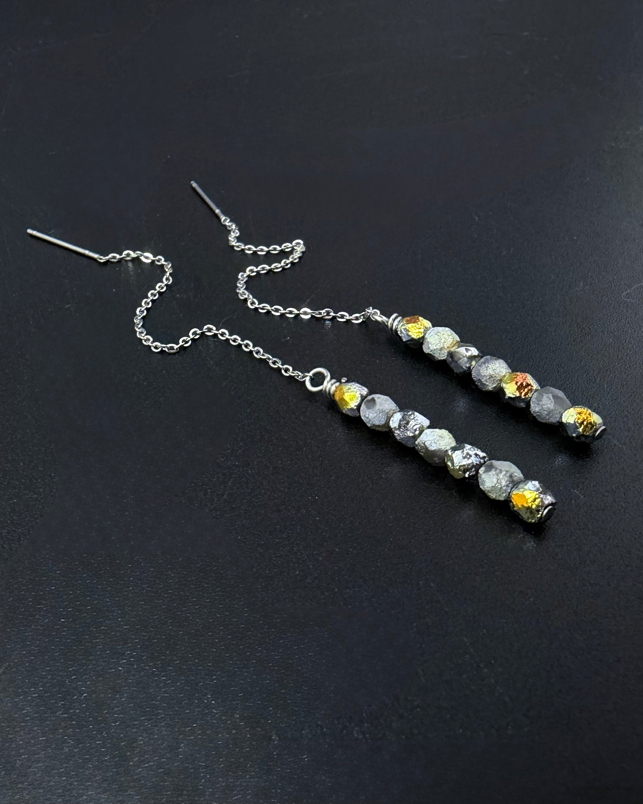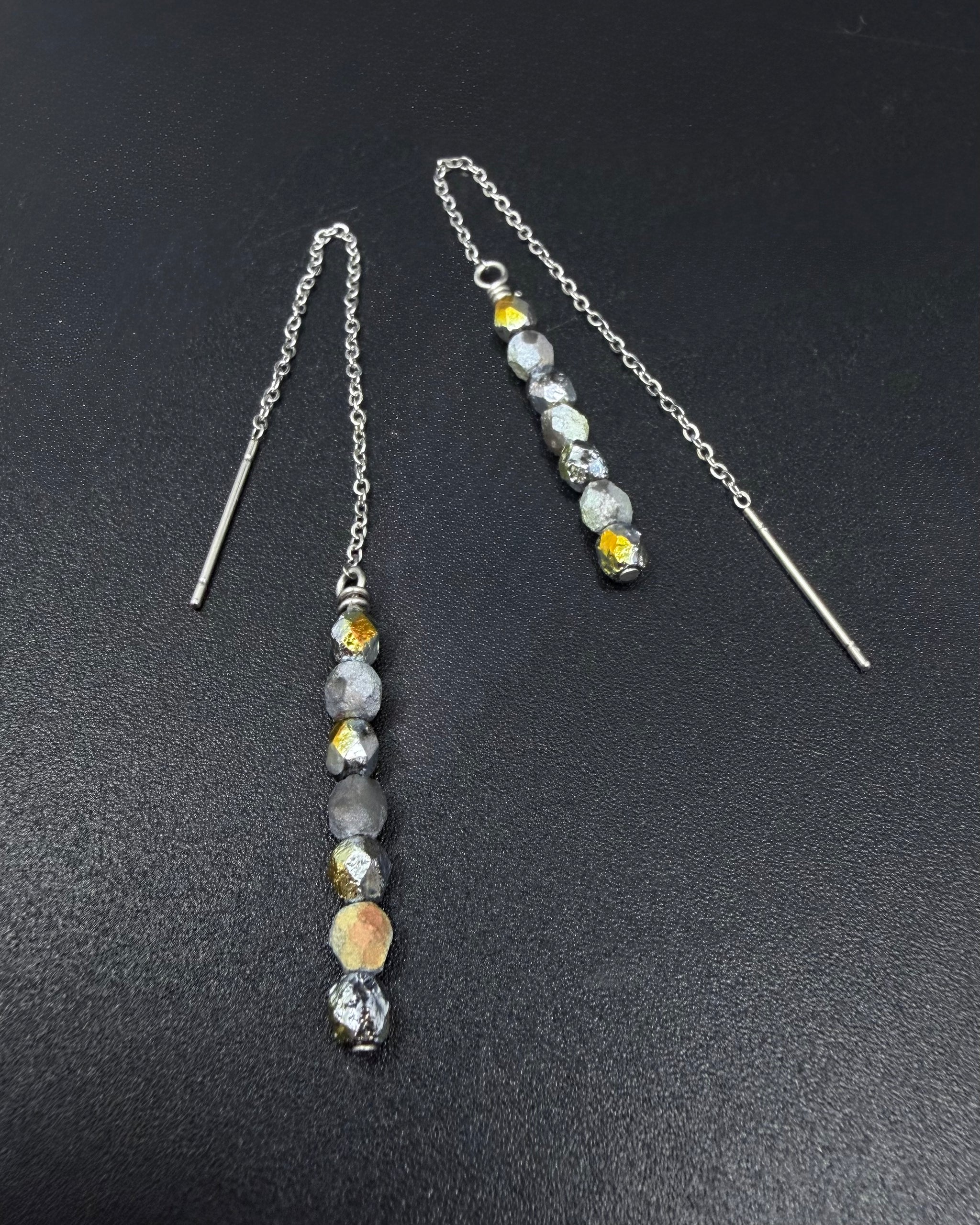 The Eos Ear Threaders in silver with mixed silver and gold fire-polished beads bring warmth and clarity into quiet alignment. Fine silver chains glide through the ear, finished with softly faceted beads that catch light in muted flashes.
