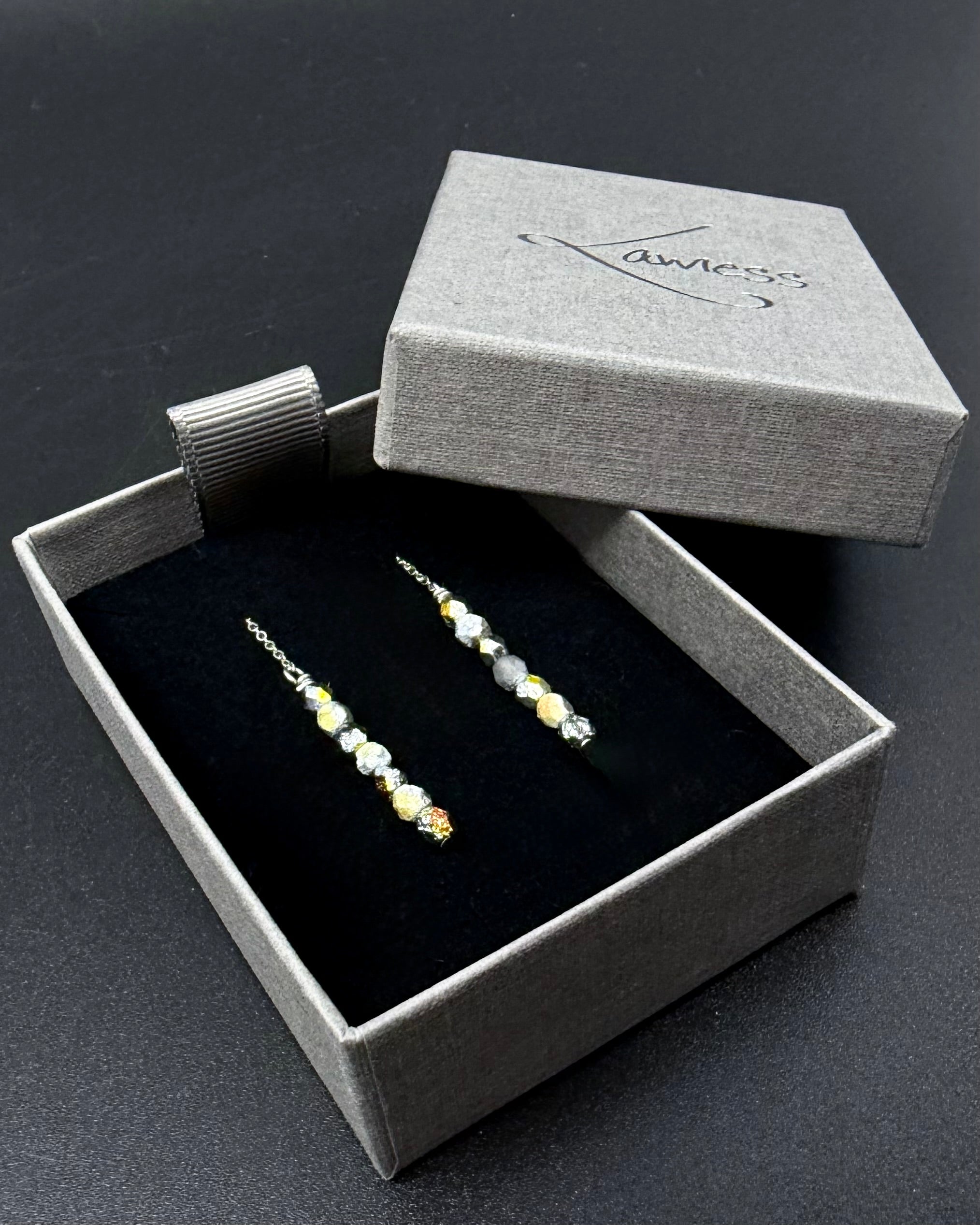 Designed to move freely, these ear threads offer fluidity without fuss. The mixed metallic tones echo the Eos philosophy of thresholds: light meeting shadow, restraint balanced with glow. Adjustable in length, they can be worn long and expressive or drawn shorter for a more contained silhouette.