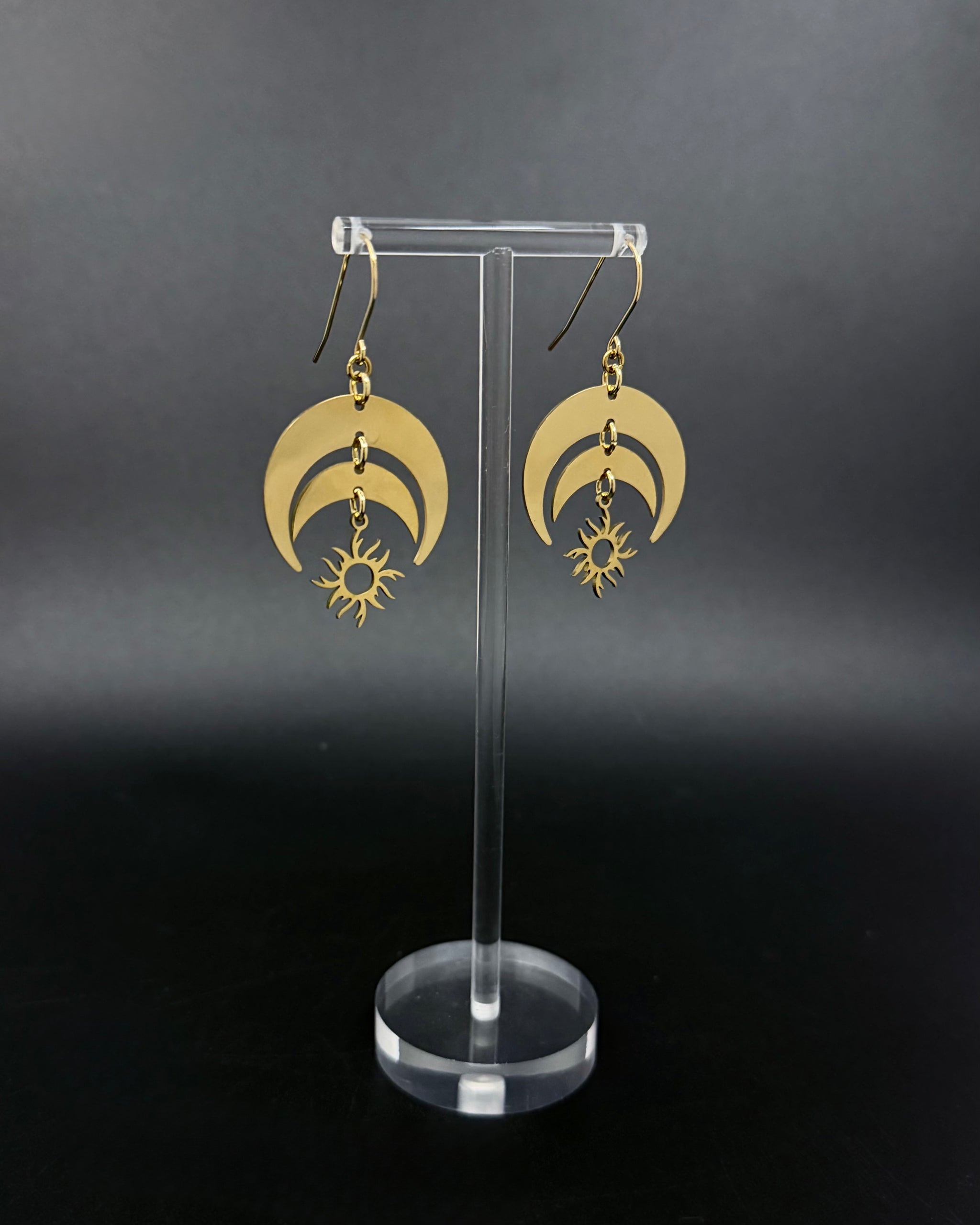 The Eos Balance Earrings in gold are equilibrium warmed by light — layered crescents suspended in deliberate alignment, finished with a radiant solar form that glows rather than dazzles. Cohesive and composed, they carry warmth with discipline.