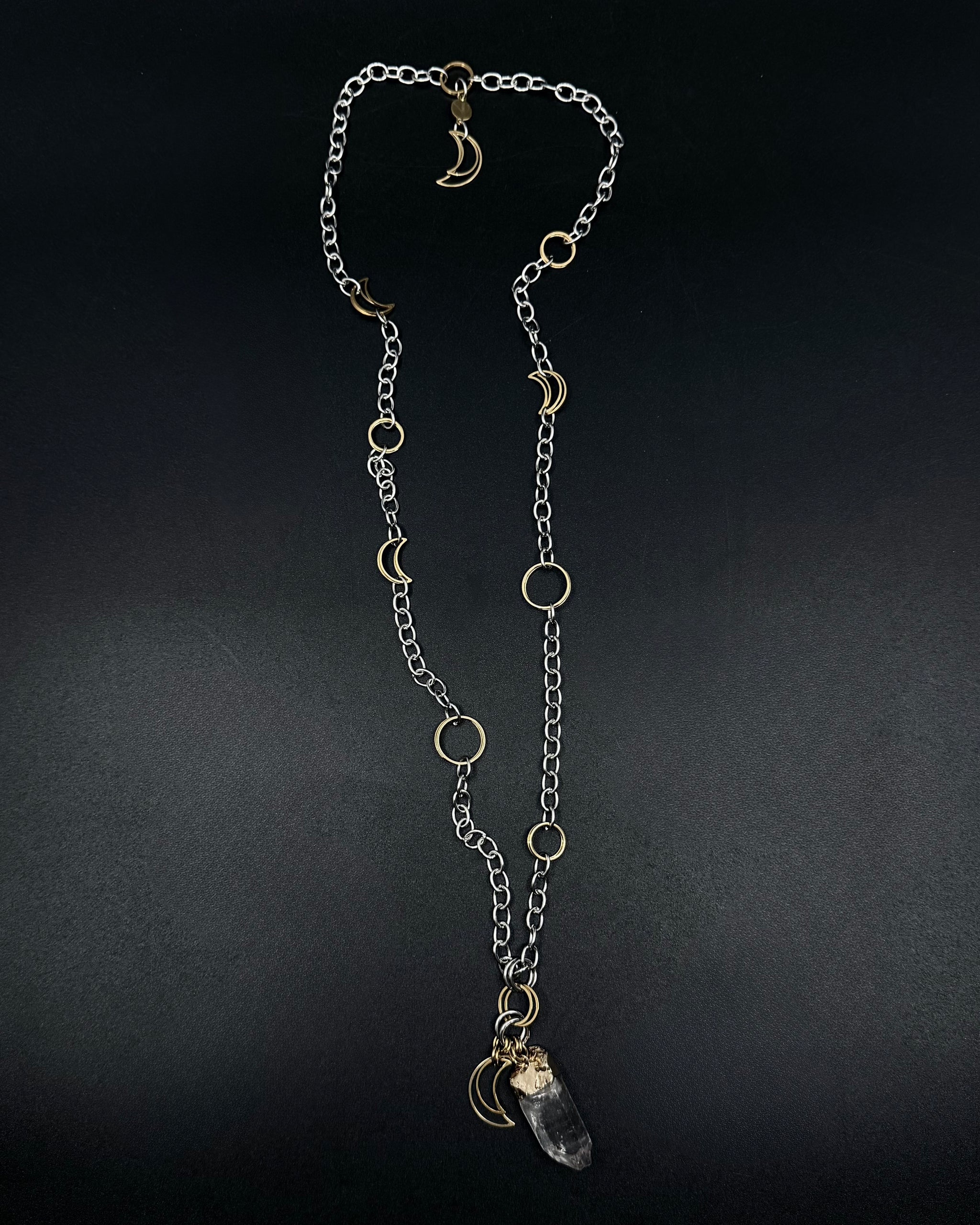 This piece explores liminality: the space between phases, decisions, identities. The crescent moon speaks to intuition and cycles. The sun offers clarity and resolve. At the base, a natural quartz crystal hangs with weight and purpose — grounding the piece in focus and amplification. Each element is deliberate; nothing is ornamental without meaning.