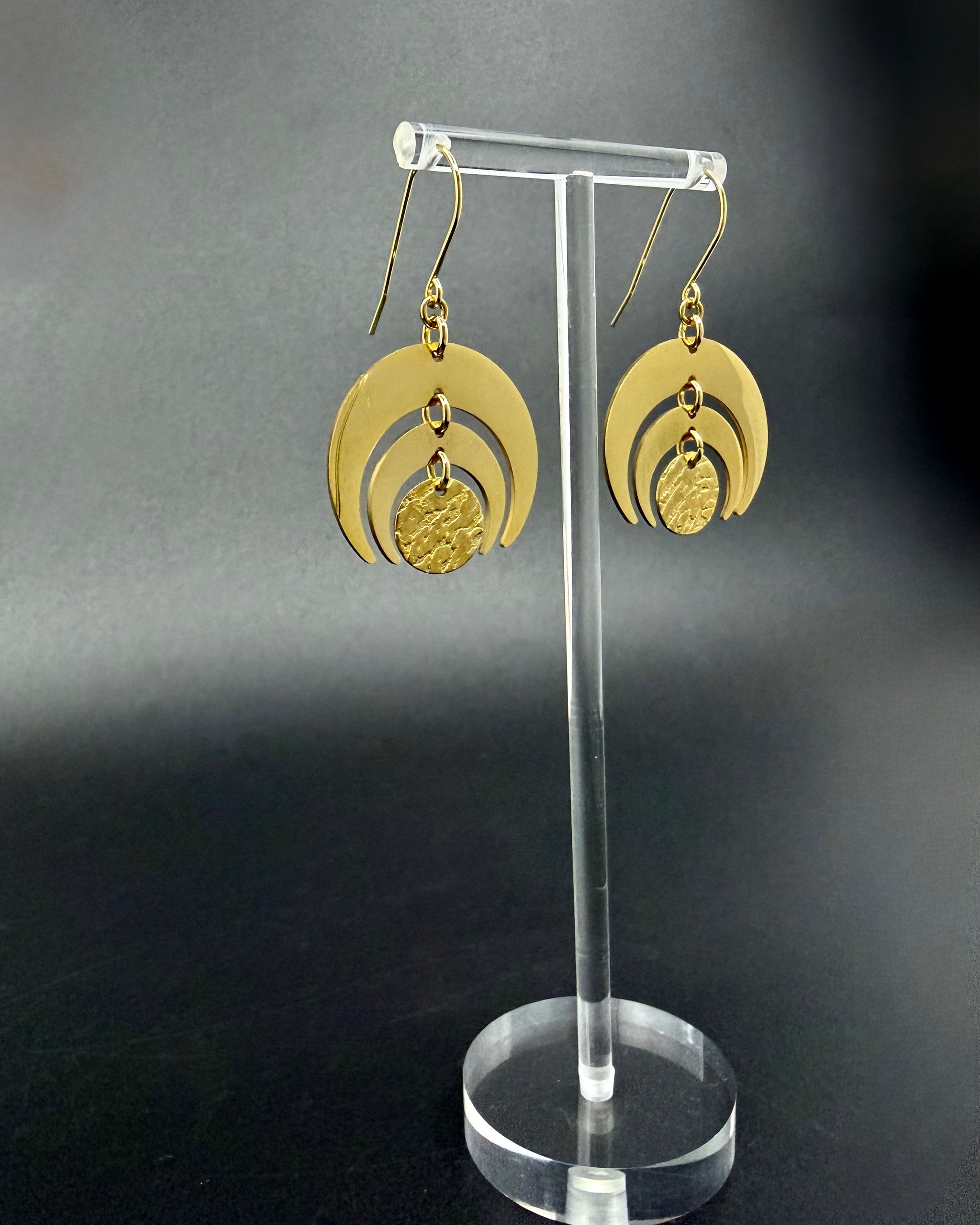 Features: Oversized triple-crescent structure · textured central disc · lightweight · hypoallergenic · tarnish-resistant