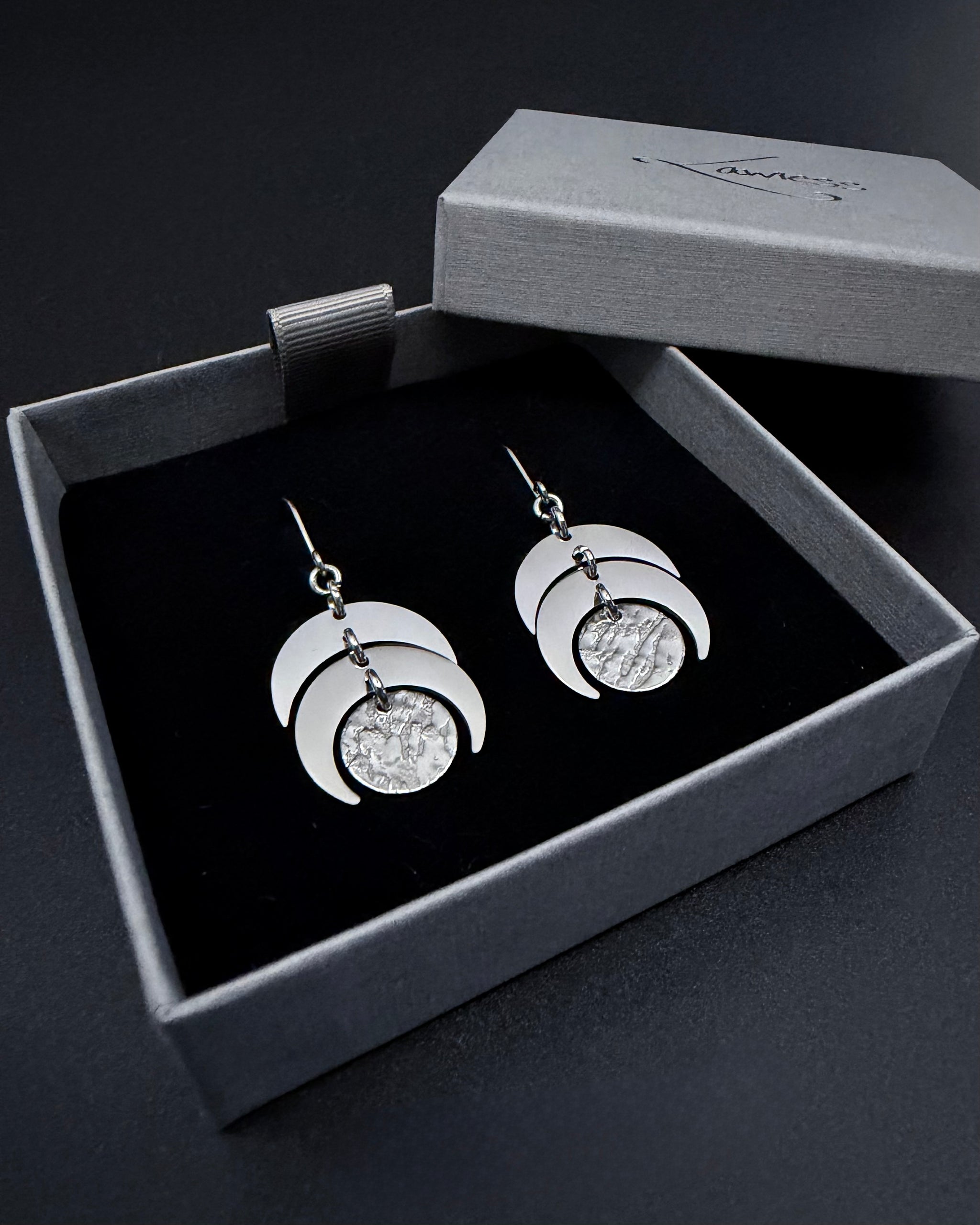 Features: Sculptural lunar symbology · textured disc detail · lightweight design · hypoallergenic stainless steel