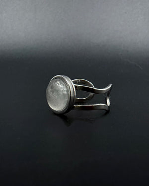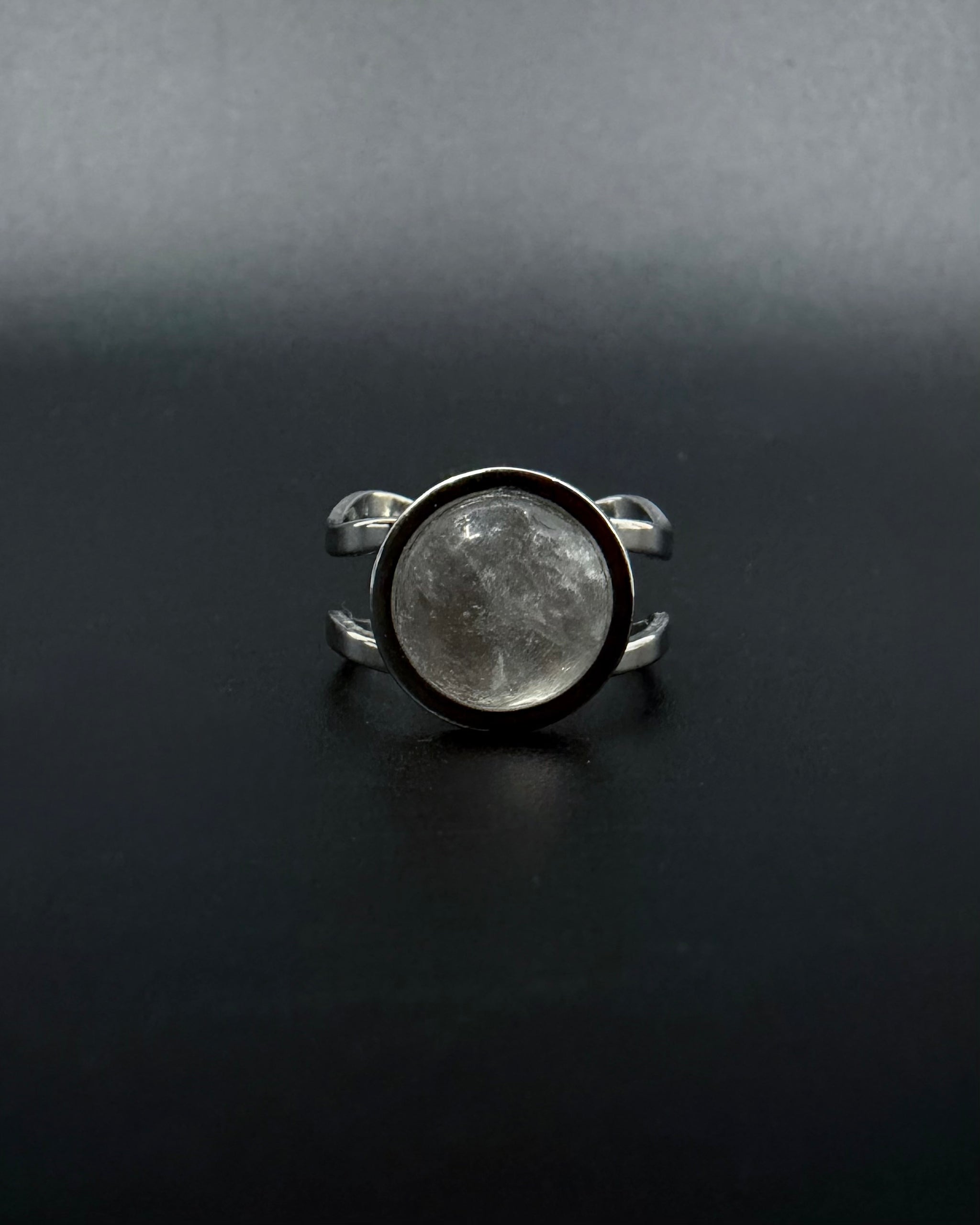 The Nebulae Core Ring in quartz crystal is clarity distilled. A 10 mm domed quartz cabochon sits within a silver-toned double-shank adjustable band, its clear surface catching light with calm precision — clean, luminous, and uncompromisingly focused.