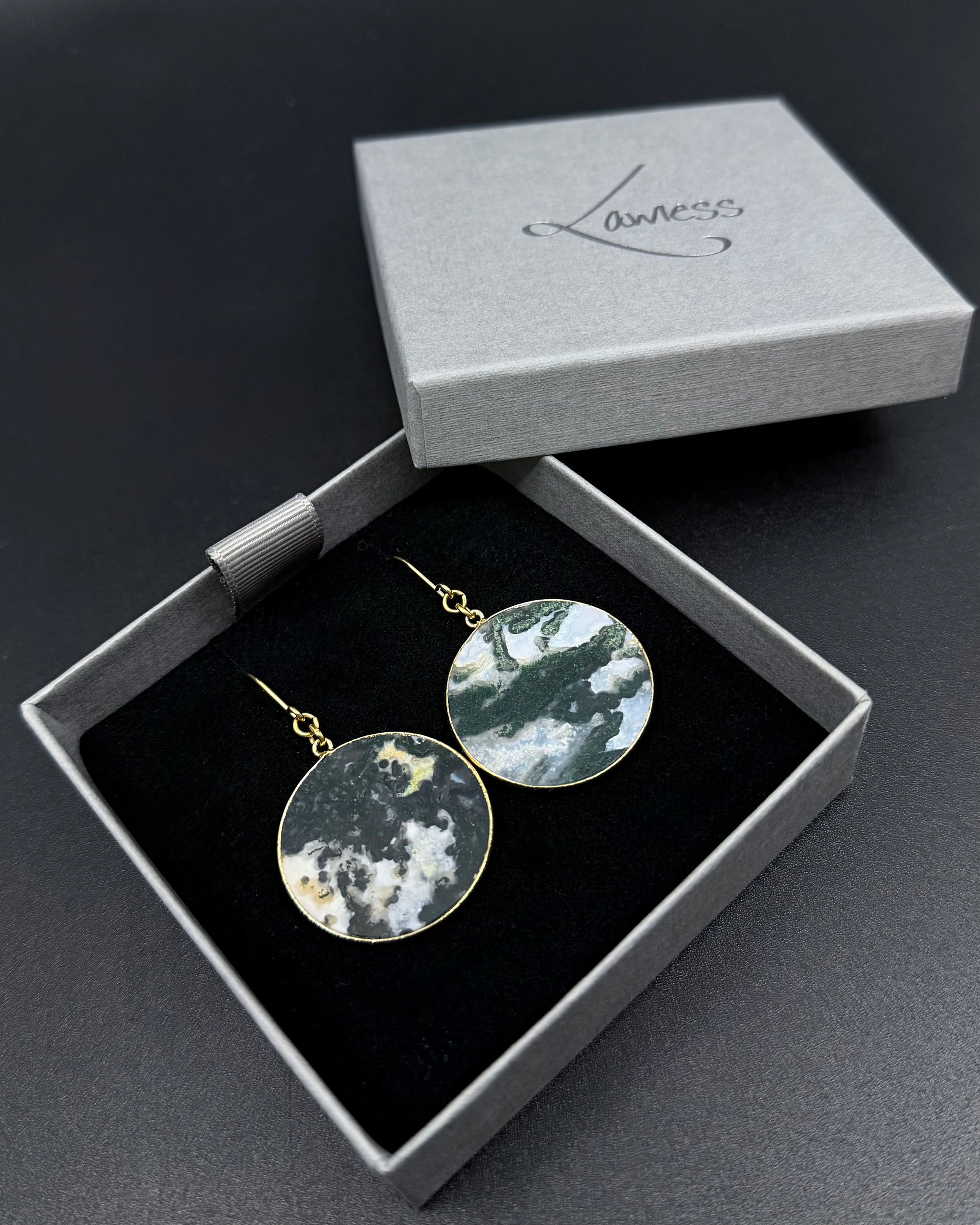Each Moss Agate stone is naturally unique in pattern, clarity, and inclusion — no two pairs are ever the same, making your earrings entirely your own.