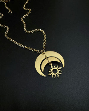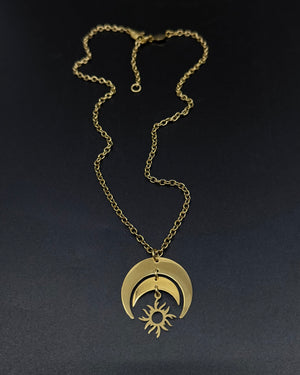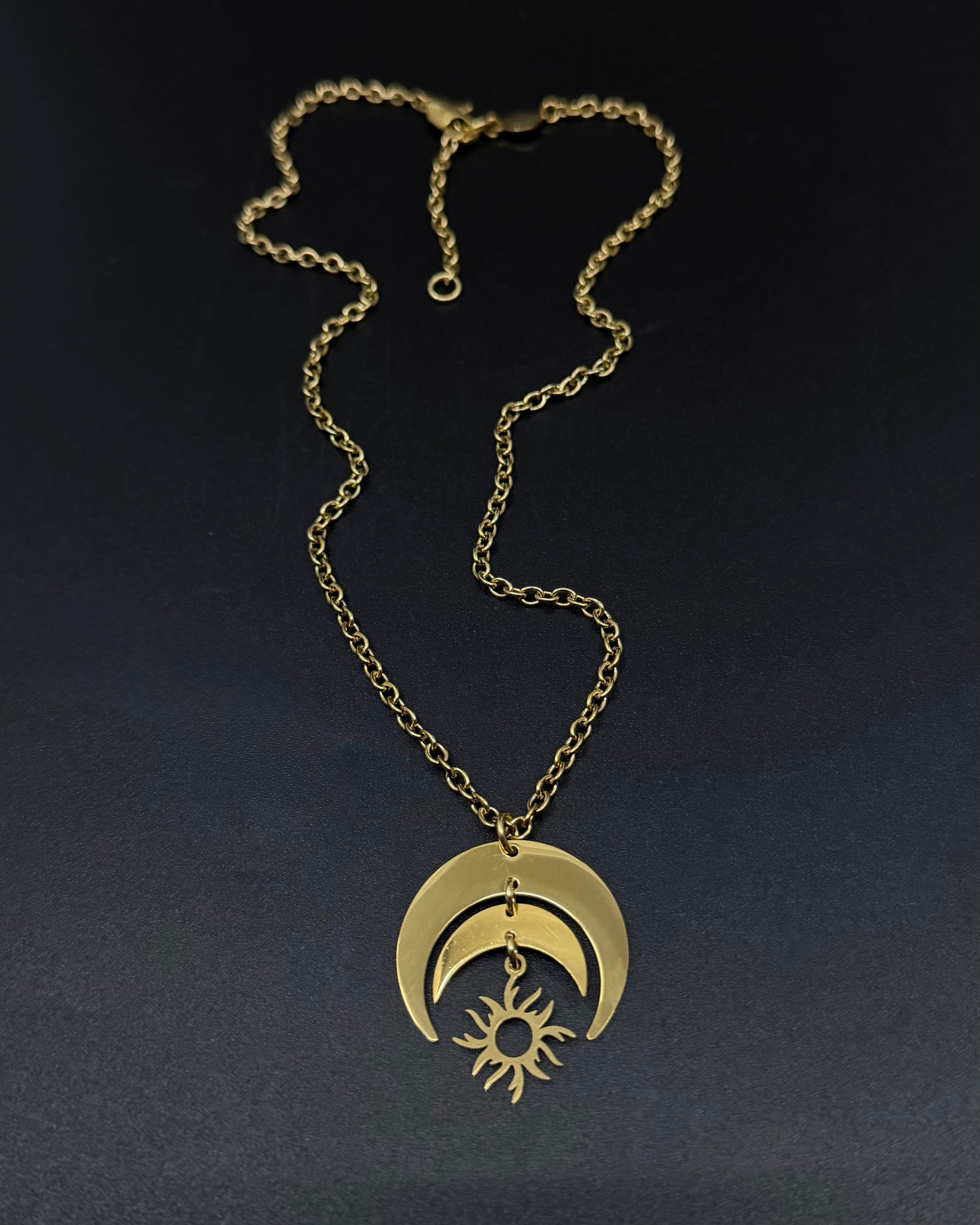 Monochrome crescent pendant · articulated sun charm · adjustable chain length · hypoallergenic · tarnish-resistant
