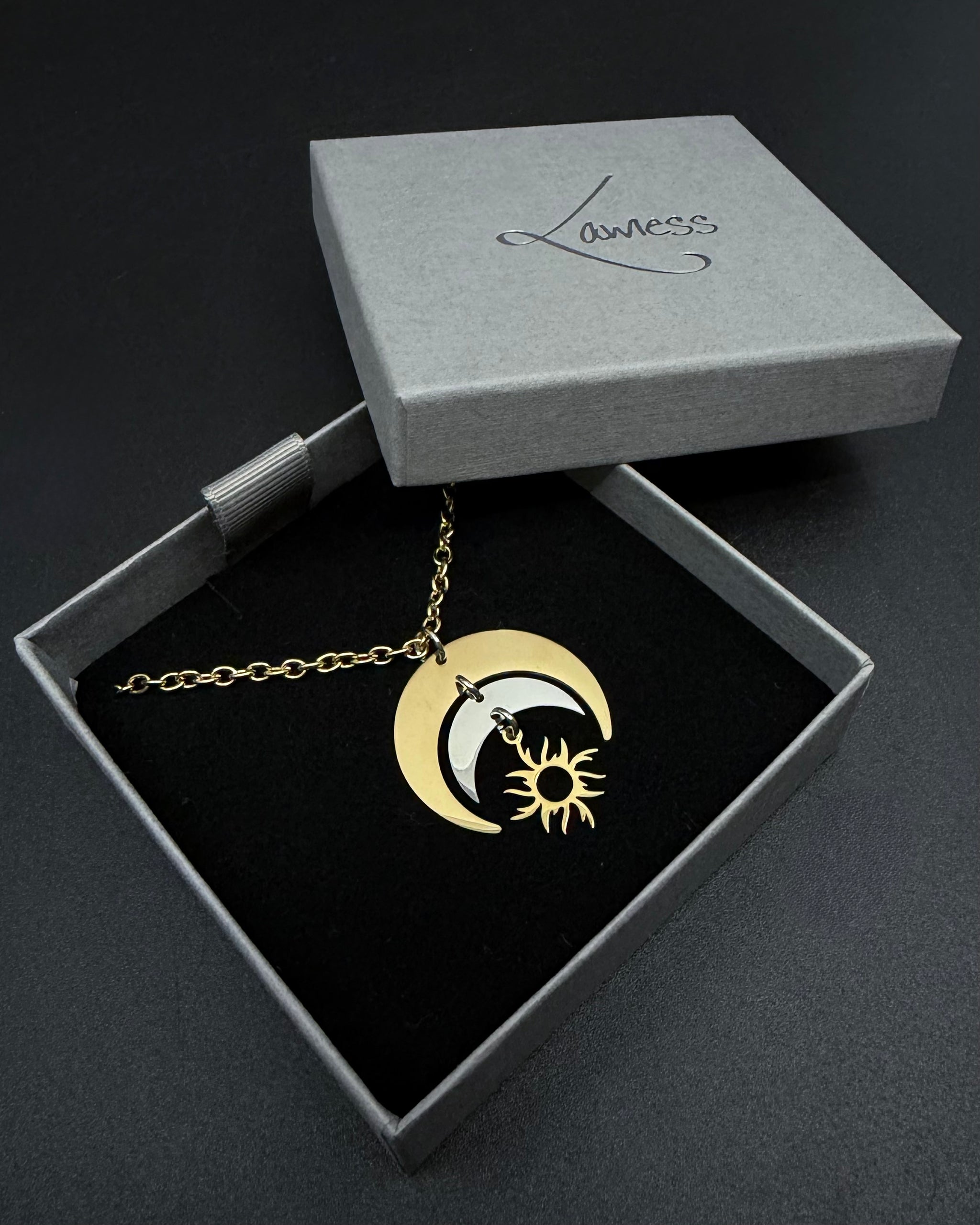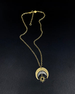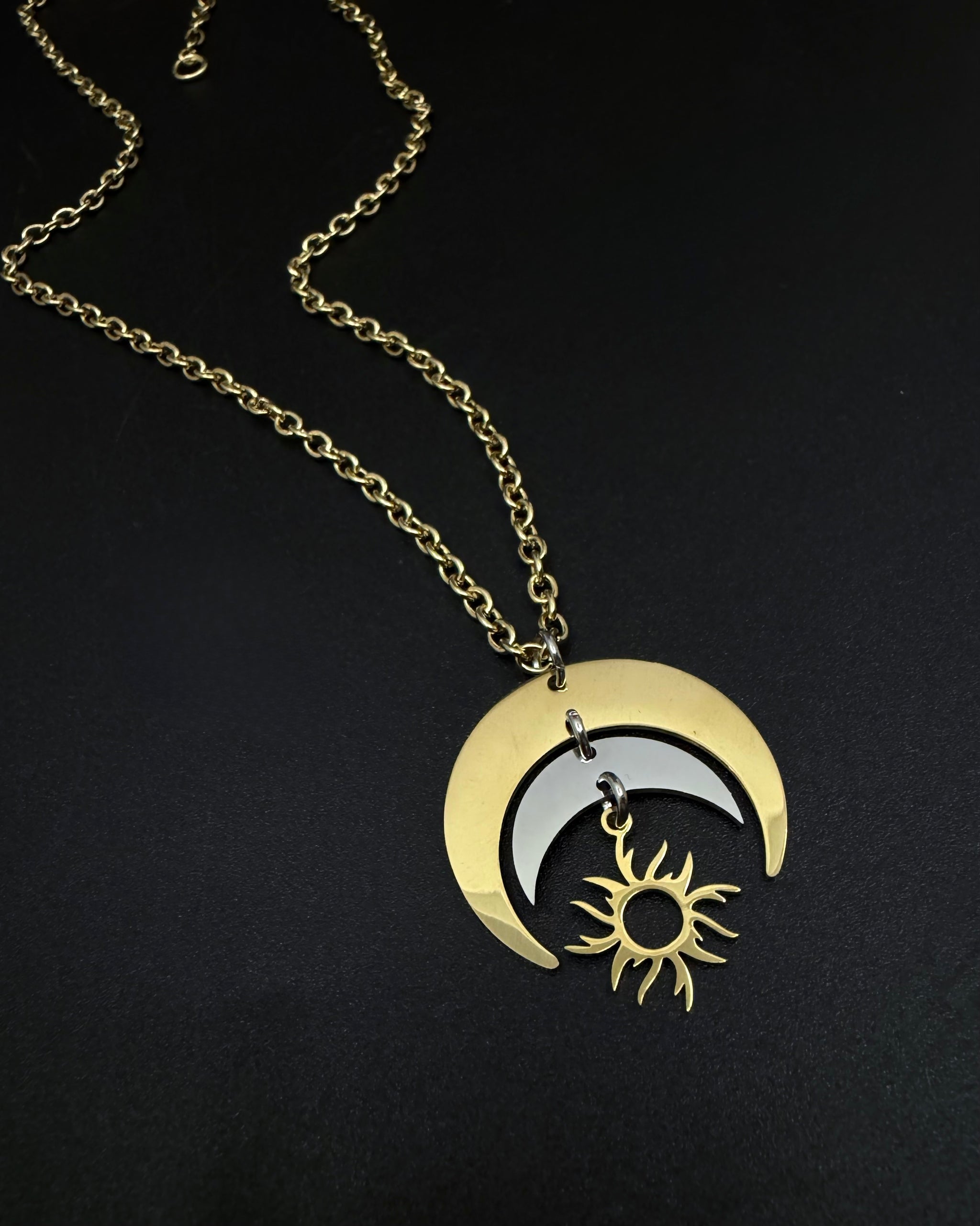 Mixed metal crescent pendant · articulated sun charm · adjustable chain length · hypoallergenic · tarnish-resistant