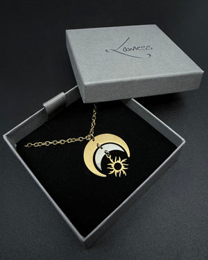 The Eos Balance Necklace in gold and silver is equilibrium made visible — a sculptural crescent suspended at the centre of the chest, layered with cool silver and anchored by a radiant solar form that moves with subtle intention. It rests where breath slows and clarity settles.