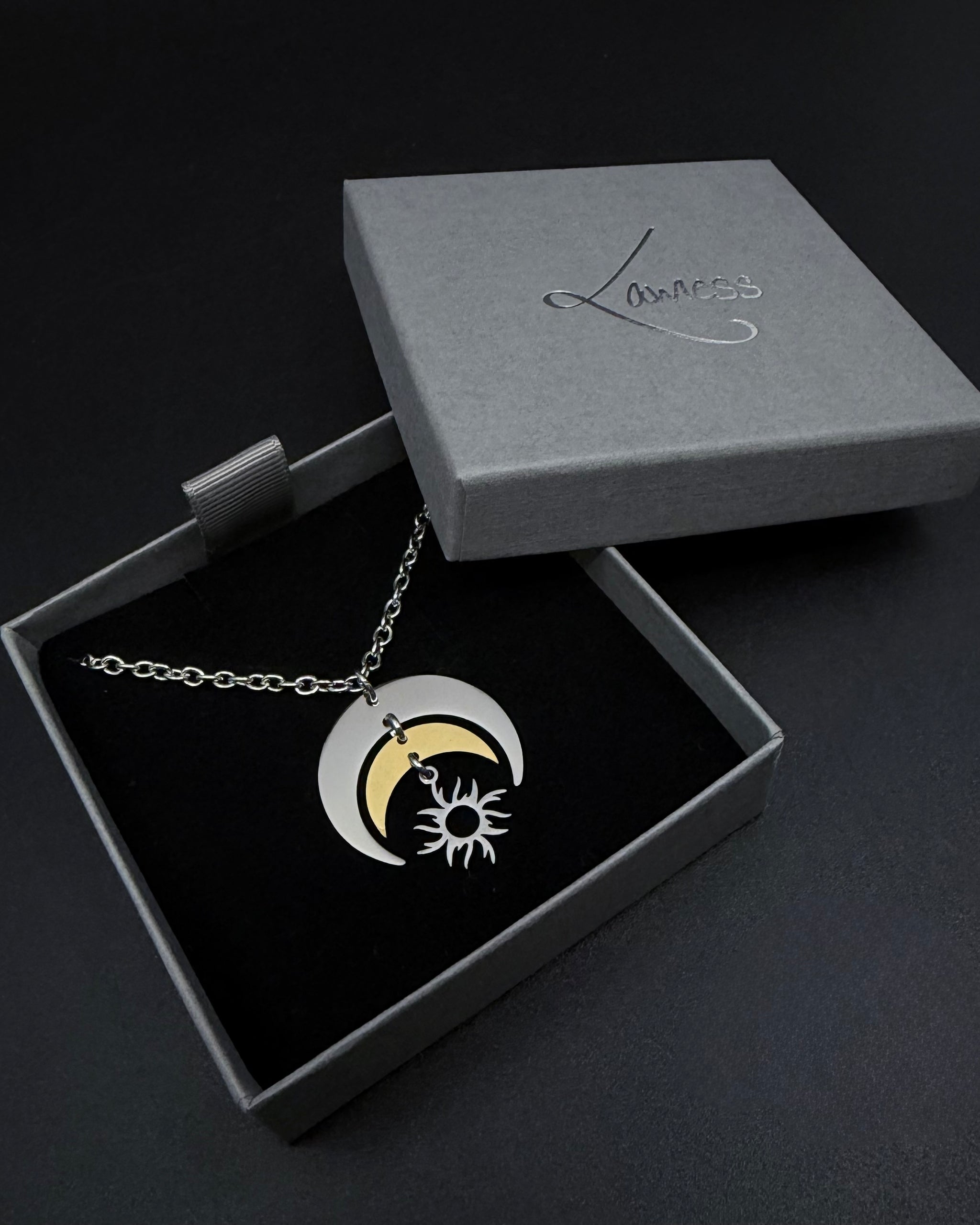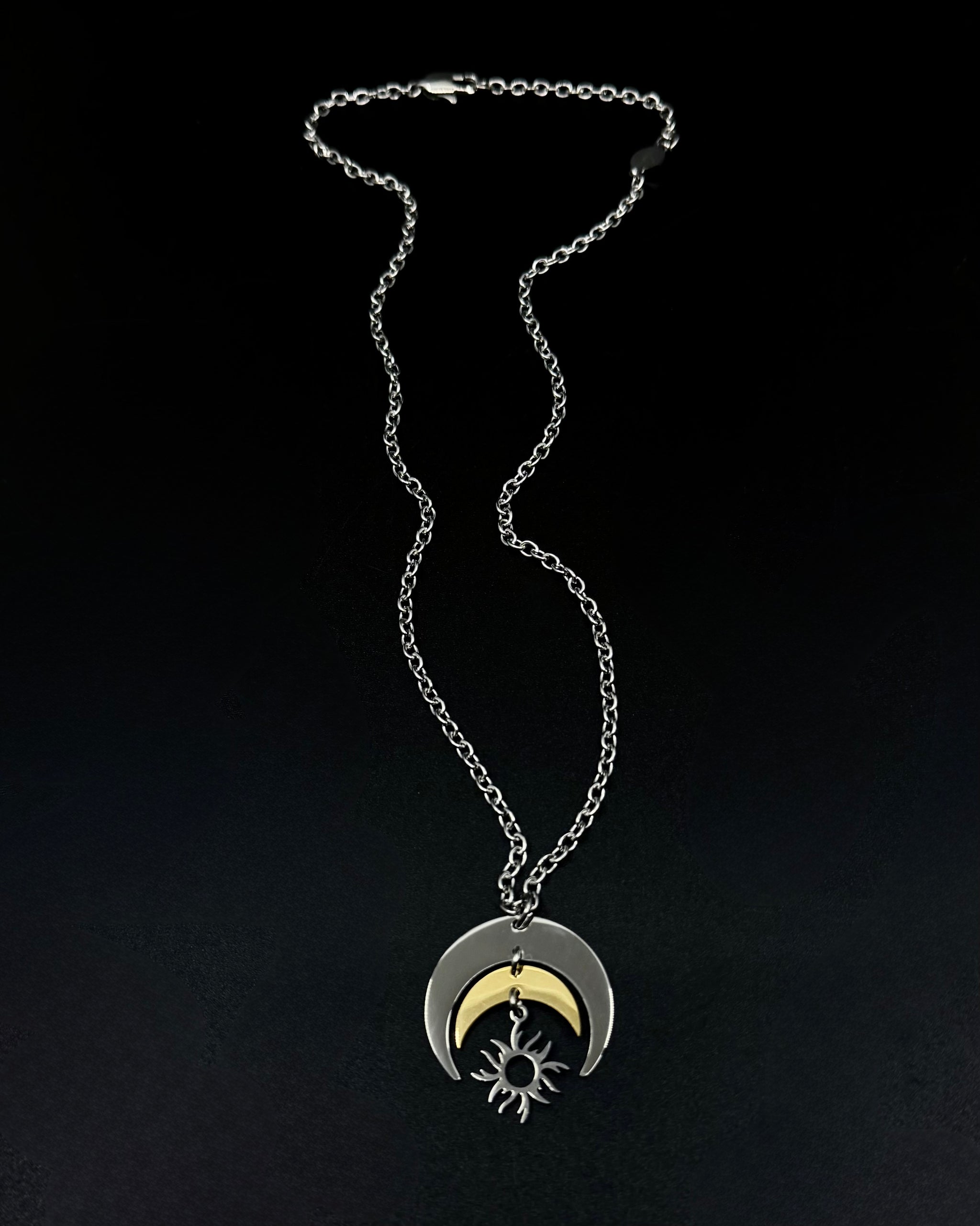 Mixed metal crescent pendant · articulated sun charm · adjustable chain length · hypoallergenic · tarnish-resistant