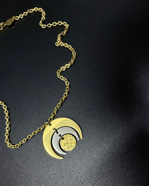 The Luna Phase Necklace in gold and silver brings warmth to the lunar story. Golden crescents arc outward with soft authority, framing a cool silver disc textured like moonstone light. The contrast feels deliberate, a solar glow held steady by lunar restraint.