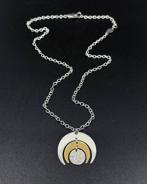 Suspended from a heavy weight gold-toned chain, the pendant moves gently with the body, catching light differently as the tones shift against one another. The mixed metals echo the rhythm of lunar cycles themselves: shadow and radiance, restraint and glow, always in dialogue.
