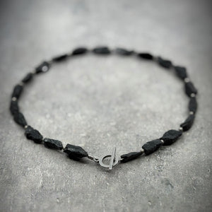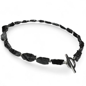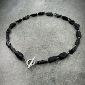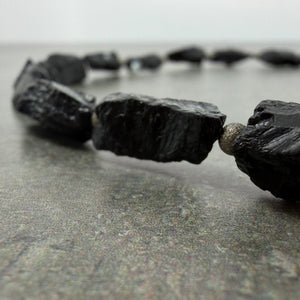 Raw and unrelenting, the Signature Necklace is sculpted from rough-cut Black Tourmaline. Each gemstone shard chosen like a ritual, strung close to the throat in a collar that hums with intent.