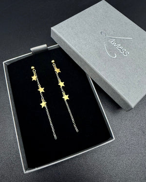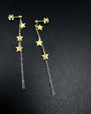 The Urania Meridian Earrings in silver and gold bring contrast into alignment. This shorter 7 cm version pairs a fine silver stainless steel chain with softly gleaming gold stars, creating a measured interplay of clarity and warmth. It’s a design rooted in balance — not symmetry for its own sake, but harmony through intention.