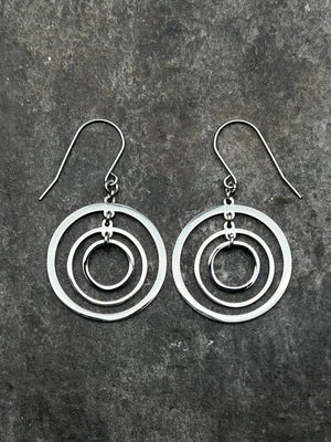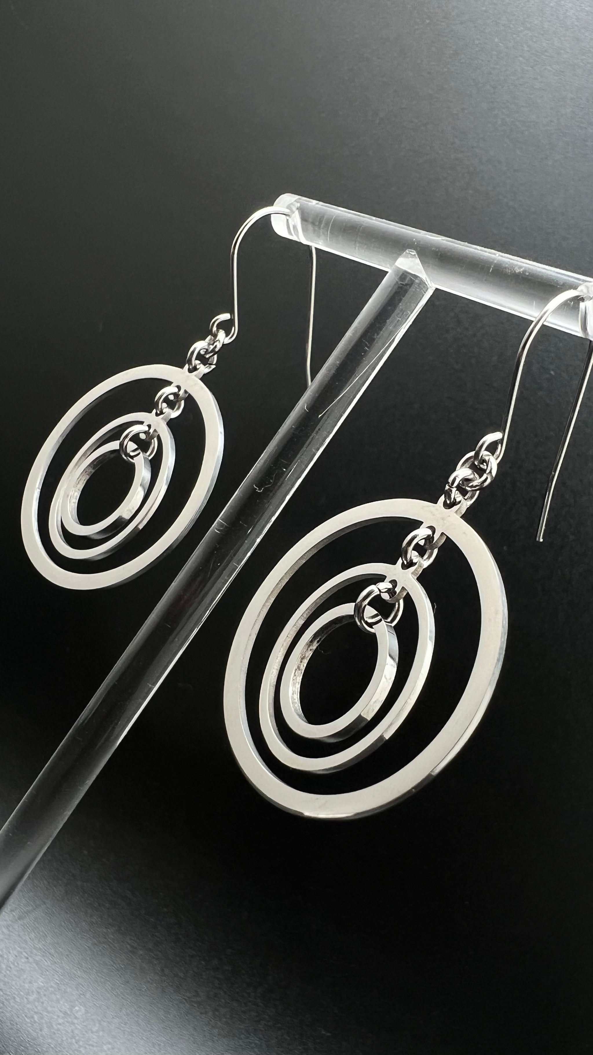 Features: Three interlinked high-polish rings · lightweight · hypoallergenic · tarnish-resistant · stainless steel ear hooks