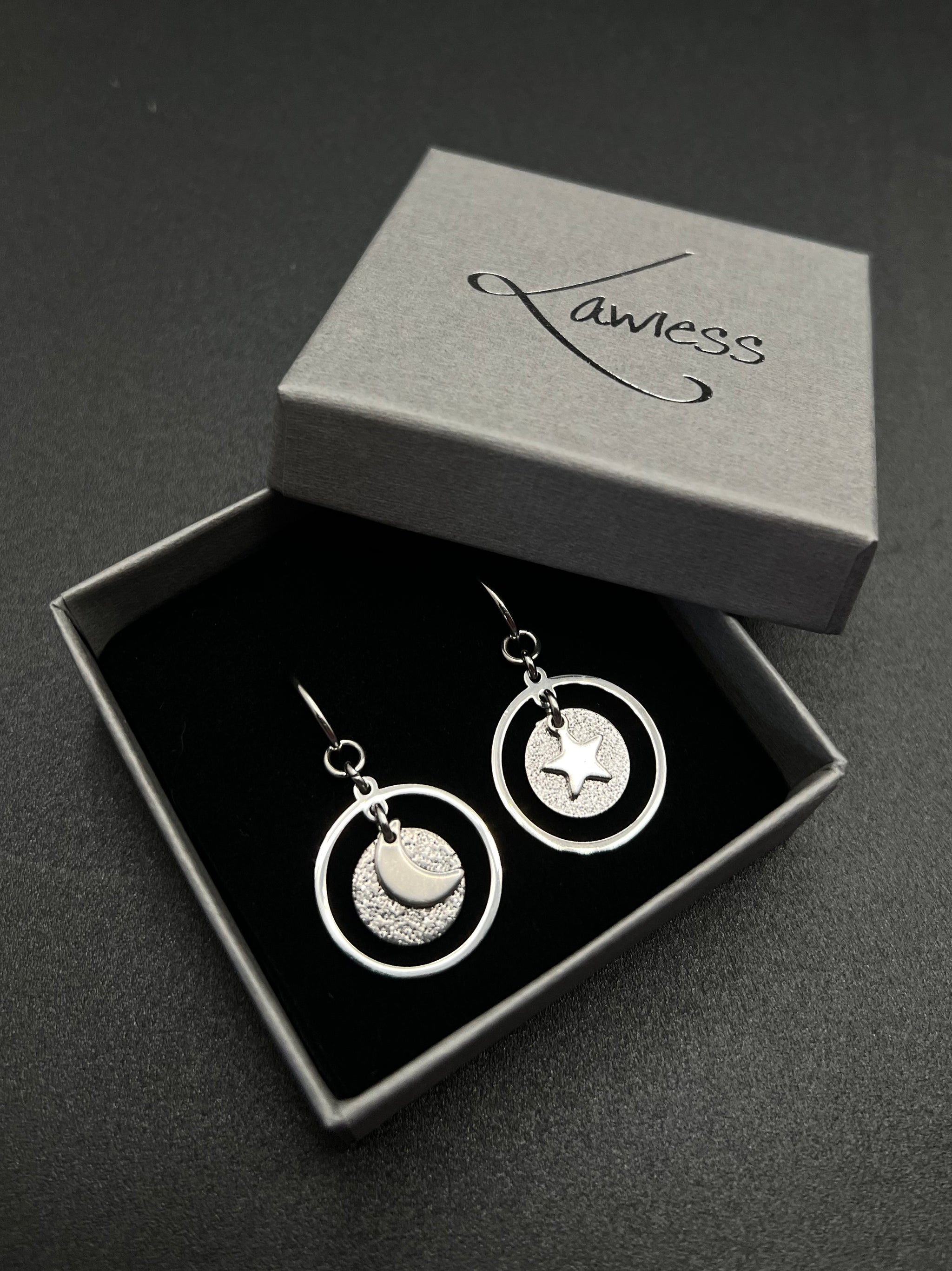 A textured silver disc nested within a 20 mm ring adds soft shimmer and fluid movement, catching light with understated elegance. Style them with the matching pendant or weave them into your layered lunar looks. These are earrings for the woman who honours every phase — and doesn’t wait for permission to shift.